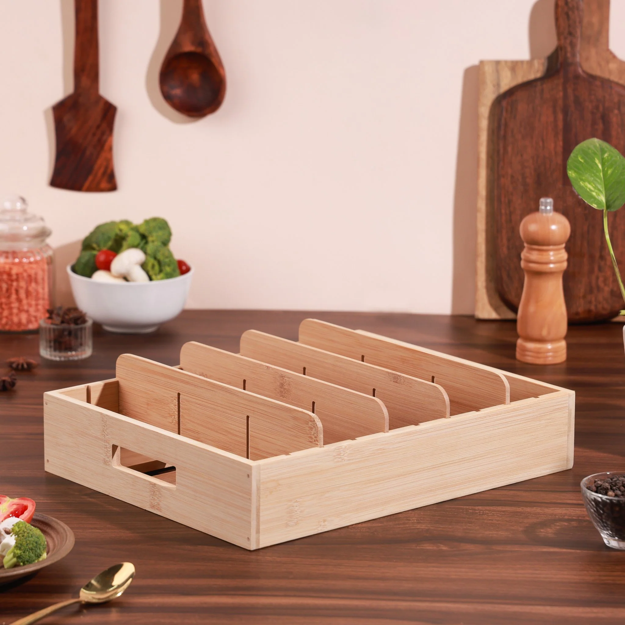 Transform your kitchen into an organized haven with this Adjustable Compartment Bamboo Storage Tray. Featuring 5 adjustable compartments, it accommodates lids, pans, tava, kadai, and pots effortlessly. Crafted from eco-friendly bamboo, this rack is durable, stylish, and space-saving. Its compact design fits perfectly in cabinets, countertops, or drawers, ensuring clutter-free storage. With easy-to-adjust dividers, it’s a customizable solution to streamline your kitchen storage while adding a natural charm to your space.