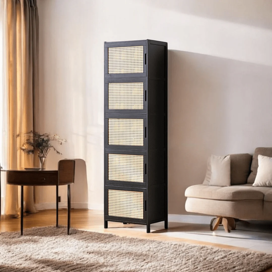 This multi-functional bamboo cabinet features a spacious multi-Tier design for organized storage. The single-door structure ensures easy access, while the plastic rattan mesh pattern allows ventilation and odor dispersion. With a seamless dust-proof structure and a smooth surface, it enhances space utilization while keeping your home neat and stylish.