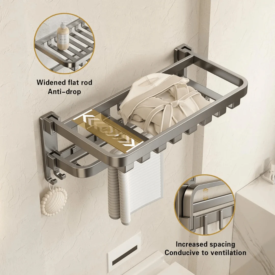 - Space-Saving Design: The towel rack features a 90-degree folding mechanism, allowing you to push it up against the wall when not in use. This compact design is ideal for small bathrooms and helps maximize available space.